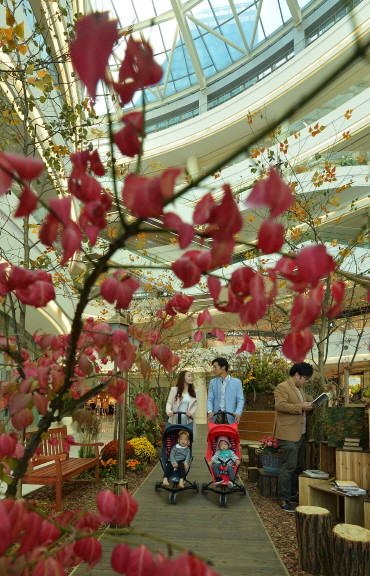 [시민일보]복합쇼핑몰 경방 타임스퀘어가 20일 오전 서울 영등포구 타임스퀘어 1층 아트리움에 가을을 주제로 단풍, 나무, 열매, 꽃 등을 이용한 친환경 ‘가을 정원’을 조성해 이곳을 찾은 고객들이 쇼핑몰 실내에서 가을 정취를 즐기고 있다.