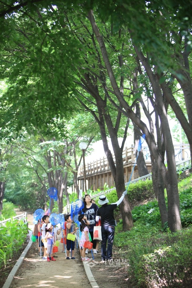 | ▲ 4코스의 송정제방길에서 매년 여름 운영 중인 매미 생태교실에 참여한 어린이들이 매미를 살펴보고 있다. | ||