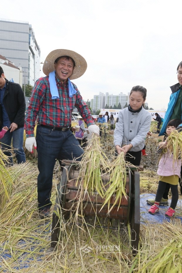 금천구는 지난 19일 시흥동 대한전선 이전부지에 위치한 금천한내텃밭에서 '호미로 일구는 마을공동체 가을걷이 한마당 행사'를 가졌다. 사진은 수확한 벼를 탈곡하는 차성수 금천구청장의 모습.
