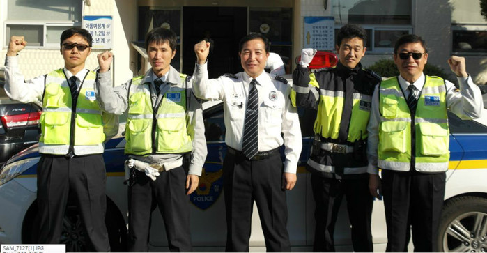| ▲ 만 2세의 응급환자를 신속히 병원으로 이송한 부평서 교통안전계 경찰관들이 파이팅을 외치며 포즈를 취하고 있다. | ||