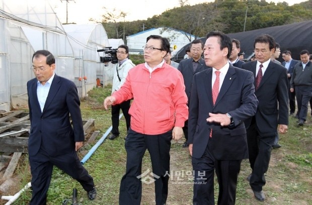 지난 22일 경기 광주시 초월읍 누에와 나비 작목반에 유기농인증원대표를 비롯한 관계자 20여명이 방문해 친환경농산물 인증농가와 간담회를 했다. 사진은 간담회 후 하우스를 둘러보는 이동필 농림축산식품장관(왼쪽)과 조억동 광주시장(오른쪽).