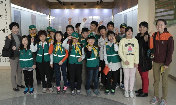 | ▲ 도자기 역사공부 및 흙가래성형 등 현장체험에 참여한 학생들이 행사를 마친 후 기념촬영을 하고 있다. | ||