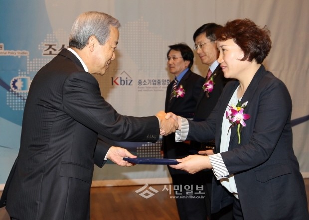 금천구는 지난 23일 서울 대한상공회의소 국제회의장에서 열린 '제10회 지역산업정책대상' 시상식에서 ‘친기업문화 조성부문 대상’을 받았다. 사진은 상을 전달받는 이미숙 지역경제과장의 모습.