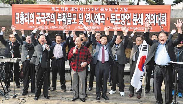 독도수호전국연대 회원들이 독도의 날을 하루 앞둔 24일 오후 서울 중랑구 면목역에서 독도의날 기념행사 및 일 총리 망언 규탄 대회를 열고 만세삼창을 외치고 있다.