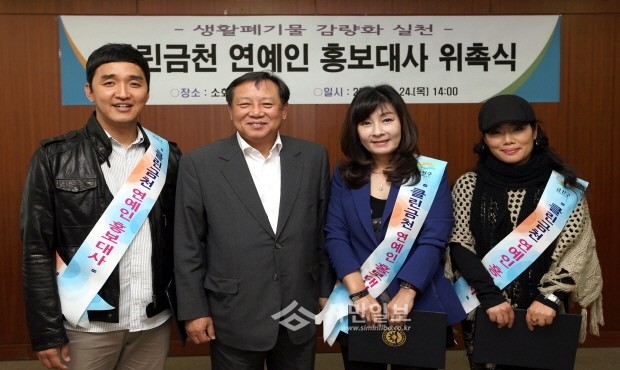 서울 금천구는 지난 24일 금천구청 9층 소회의실에서 생활폐기물 감량 추진을 위해 '클린금천 연예인 홍보대사 위촉식'을 열었다. 사진은 왼쪽부터 개그맨 임혁필씨, 차성수 금천구청장, 가수 희승연씨, 트로트가수 이란이씨.