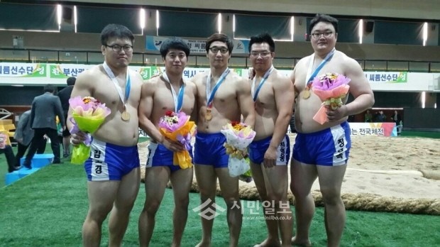 [시민일보]서울 동작구청 씨름단이 최근 제94회 전국체육대회에서 금메달 3, 동메달 2개를 획득했다. 사진은 왼쪽부터 김보경, 하봉수, 구자원, 최영웅, 장승복 선수 모습.