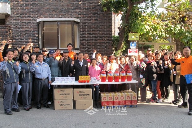 군포소방서(서장 박정준)는 지난 28일 군포시 군포1동 16통 50여 가구를 '화재없는 마을'로 선정하고 단독경보형 화재 감지기 설치 및 소화기 기증행사를 했다. 사진은 소방용품 기증식 후 기념촬영하고 있는 마을 주민들의 모습.
