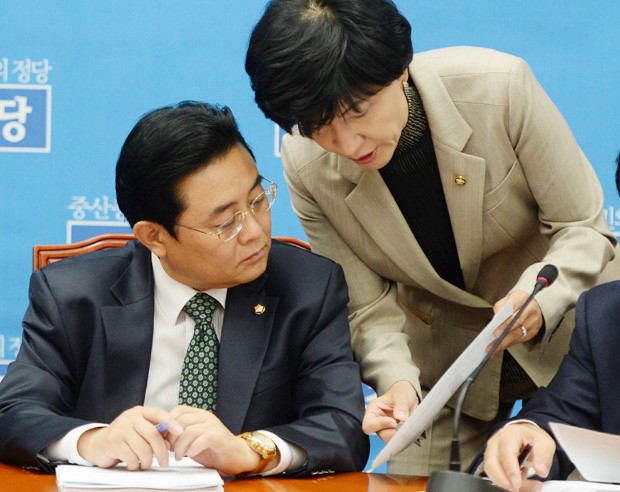29일 오전 민주당 24시 비상국회 운영본부 및 정무위 연석회의가 열린 서울 여의도 국회 원내대표실에서 전병헌 원내대표에게 정무위 김영주 간사가 국가보훈처의 선거개입 내용이 담긴 표를 보여주며 설명하고 있다.