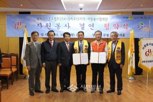 지난 28일 구청 창의홀에서 구로구 자원봉사협력단과 국제라이온스협회 354-D지구 구로구지역 소속클럽이 자원봉사 결연 협약을 체결했다. 사진은 협약식에 참여한 이성 구로구청장, 박석희 자원봉사협력단장협의회장, 국제라이온스 협회 354-D지구 15지역 권성태 부총재 등이 기념촬영하는 모습.