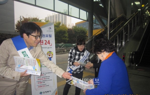 [시민일보]경기 의정부시 시민봉사과 직원들은 지난 29일 다중이용시설 중 유동인구가 많은 의정부역사와 회룡역사에서 출근하는 시민들을 대상으로 '민원24'의 수수료 면제 등 유익한 정보를 홍보했다. 사진은 지하철에서 홍보전단지를 나누어주고 있는 구청직원들.