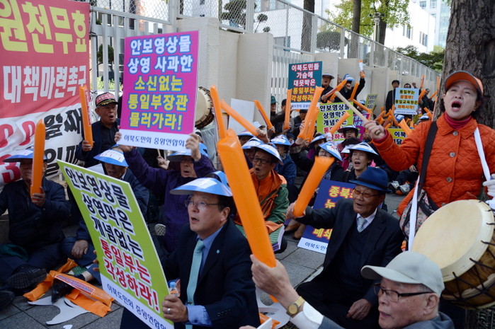 이북도민중앙연합회가 30일 오후 서울 종로구 세종로 정부서울청사 후문에서 '종북세력 척결 궐기 대회'를 열고 있다. 이들은 안보영상물 상영 막는 통일부 각성, 종북좌파 눈치보는 통일교육원 폐쇄 등을 주장했다.