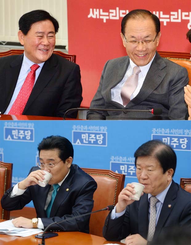 10.30 재보궐선거 2곳이 새누리당 후보의 당선으로 끝난 가운데 31일 오전 국회에서 새누리당 황우여, 최경환(사진 외쪽) 원내대표가 최고위원회의 중 웃고 있는 가운데, 민주당 24시 비상국회 운영본부회의 중 전병헌 원내대표, 박병석 국회부의장이 물을 마시고 있다.
