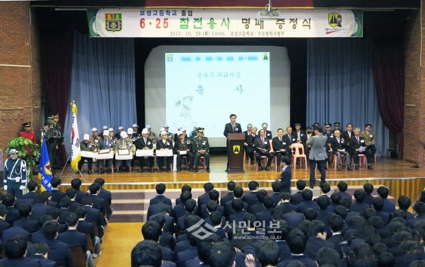 서울 송파구의회 박용모 의장는 지난달 29일 보성고등학교에서 열린 6.25 참전용사 명패 증정식에 참석해 보성고 출신으로 6.25에 참전한 153명의 용사들의 이름을 새긴 명패를 보성고등학교에 기증했다. 사진은 증정식에서 축사를 하고있는 박용모 의장의 모습.