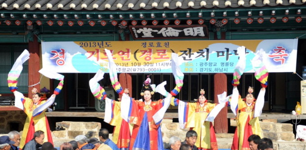 경기 하남시 광주향교는 지난달 30일 광주향교 명륜당 마당에서 노인 1000명을 초대해 하남전통예술단의 궁중무용, 부채춤, 민요메들리 등 다채로운 행사로 꾸며진 기로연(耆老宴)을 열었다. 사진은 하남전통예술단이 궁중무용을 공연하는 모습.