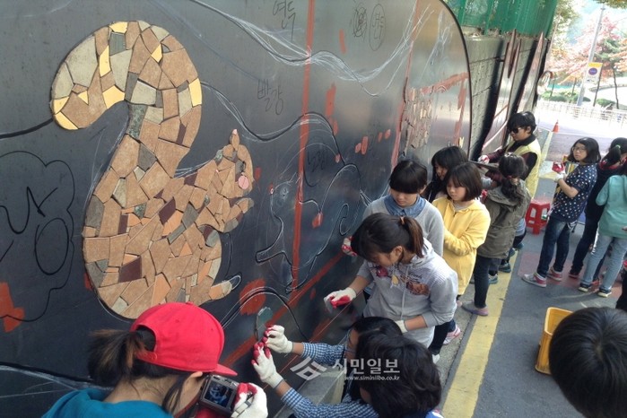 지난달 31일 타일 아티스트 김동진씨 외 3명의 작가와 안양동초등학교 학생들이 학교 옹벽에 타일을 붙여 '스푸르지 마을 산비탈 학교'를 소재로 한 디자인 작업을 벌였다. 사진은 작가들과 함께 직접 디자인 작업에 참여 중인 안양동초등학교 학생들의 모습.