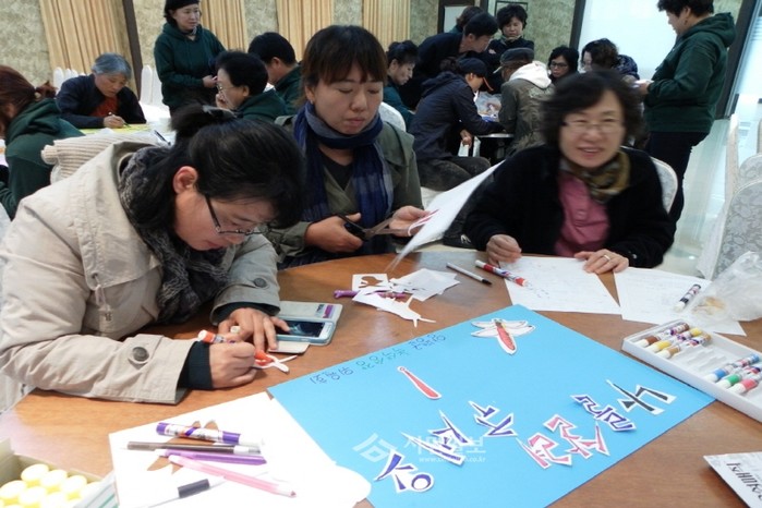 지난달 29일 경기 양평군 녹색성장위원회의 회원 40여명이 참여해 양평군민회관 사거리에서 에너지절약 캠페인을 열었다. 사진은 캠페인에 사용할 피켓을 만들고 있는 녹색성장위원회 회원들의 모습.