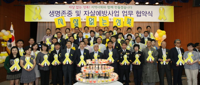 | ▲ ▲ ‘자살 없는 성북! 지역사회와 함께 만들겠습니다!’라는 캐치프레이즈 아래 4일 오후 성북구내 성북아트홀에서 열린 '생명존중 및 자살예방사업 업무 협약식'에서 참석자들이 생명의 소중함을 상징하는 노란리본을 들고 기념촬영을 하고 있다. | ||
