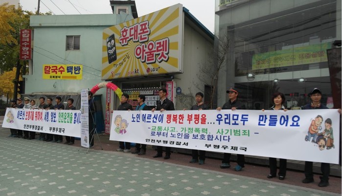 | ▲ 부평서 직원들과 부평우체국 직원들이 노인어르신 안전을 위한 캠페인을 전개하고 있다. | ||