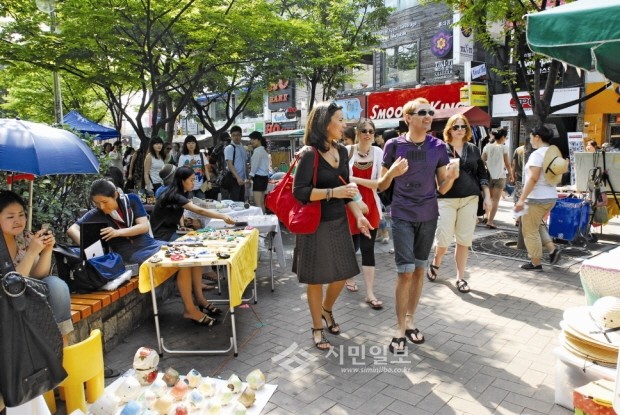 | ▲ 홍대 거리의 프리마켓을 구경중인 외국인 관광객 모습. | ||