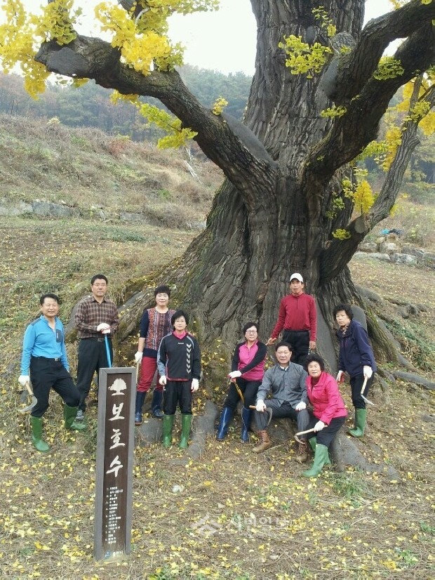 경기 용인시 수지구 동천사랑회(회장 김근기)는 7일 동천동 917번지에 위치한 보호수(수령 600년 은행나무) 살리기 운동을 펼쳤다. 동천사랑회는 보호수 주변의 제초작업과 청소, 배수로 정비 등 관리 작업을 실시했으며 사진은 보호수 살리기 운동에 참여한 회원들 모습.
