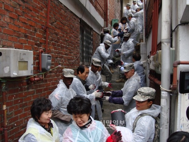 지난 6일 (사)한외국인친선문화협회와 미8군이 홍은1동 호박골마을의 연탄이 필요한 20여가구에 총 6천장의 연탄을 배달하고 침낭 등의 후원물품을 전달했다. 사진은 연탄을 배달하는 협회 회원들과 미군부대원들의 모습.