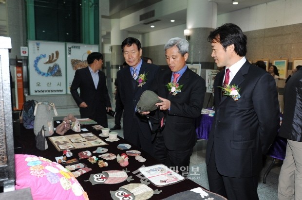 오산시 주민자치위원회는 지난5~6일 시청 1층 로비에서 6개동 주민자치센터 문화강좌 수강생들의 작품전시회를 열었다. 사진은 전시회를 둘러보고 있는 곽상욱 시장(가운데)과 김덕우 오산시주민자치 협의회장, 신장동 주민자치위원장의 모습.