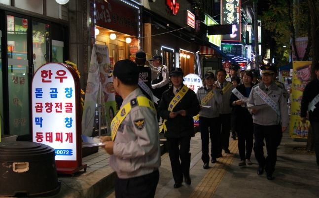 | ▲ 다 같이 동네한바퀴 합동순찰 참가자들이 거리홍보를 벌이고 있다. | ||