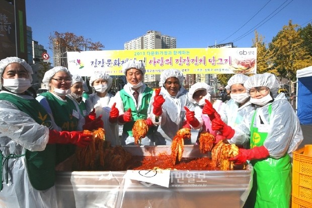 서울 성북구는 지난 8일 구청 바람마당에서 베트남, 코트디부아르, 우즈베키스탄, 필리핀 등의 다문화가정 여성들이 모여 ‘2013 사랑의 김장담그기’ 행사를 진행했다. 사진은 김장담그기에 참여한 김영배 성북구청장이 다문화가정 여성들과함께 김장을 하고 있는 모습.