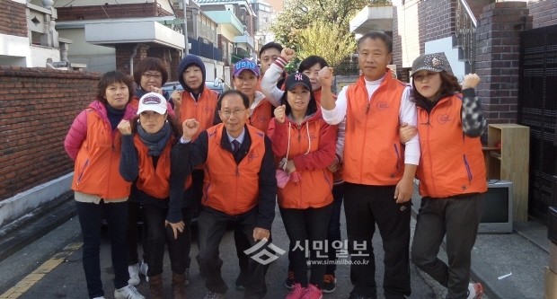 지난 7일 서울 동작구 '상도3동 참 좋은 봉사단'은 지역내 홀몸노인의 집을 방문해 벽지와 장판을 교체해주는 봉사를 펼쳤다. 사진은 인테리어 업체를 운영하면서 봉사단의 단장을 맡고 있는 민경희씨와 회원들 모습.