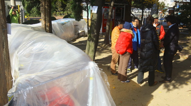 10일 오후 경기 수원지방법원의 방청권배부처 앞에서 탈북자 등으로 구성된 보수단체 회원 60여명이 천막을 치고 이석기의원의 재판 방청권을 받기위해 벌써부터 줄을 서 있다. 이들은 오는 12일 오후 2시로 예정된 내란음모 사건의 법정 방청권을 얻기 위해 사흘전인 지난 9일 낮부터 방청권배부처에서 줄을 섰다.