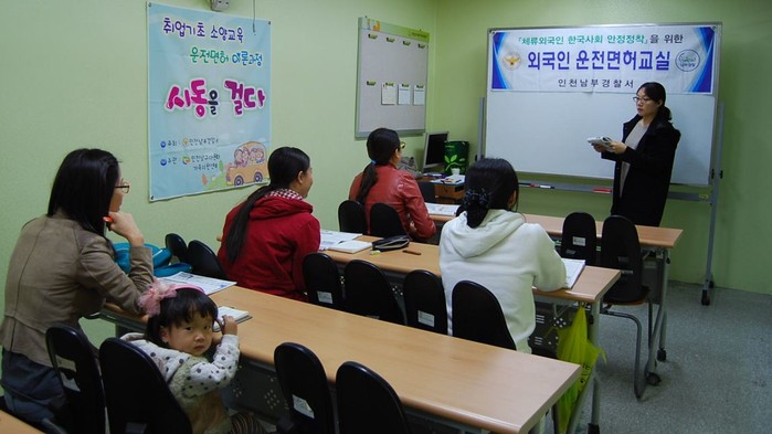 | ▲ 남부서 직원이 결혼이주여성들을 대상으로 운전면허 이론 강의 및 4대 사회악 근절을 홍보를 하고 있다. | ||