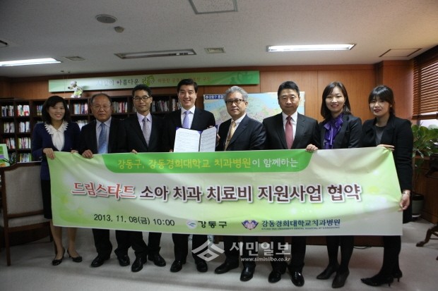 지난 8일 서울 강동구가 강동경희대 치과병원과 함께 드림스타트 대상 아동의 치과치료비를 서로 분담해 지원하는 '치과 치료비 지원 사업' 협약을 체결했다. 사진은 협약식에 참여한 이해식 강동구청장(왼쪽 네번째)과 이성복 강동경희대 치과병원장 (왼쪽 다섯번째)의 모습.
