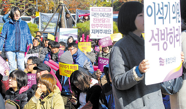 내란음모 혐의로 구속기소된 통합진보당 이석기 의원의 첫 공판이 열린 12일 오후 경기 수원지법 앞에서 통합진보당이 이석기 의원 석방 등을 요구하며 집회를 갖고 있다.