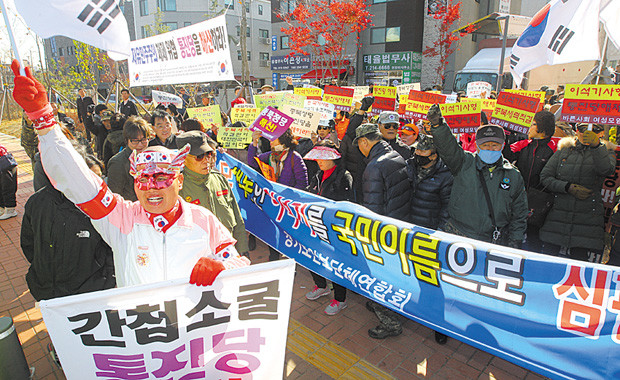 내란음모 혐의로 구속기소된 통합진보당 이석기 의원의 첫 공판이 열린 12일 오후 경기 수원지법 앞에서 보수단체가 통진당 해체 등을 주장하며 시위를 벌이고 있다.