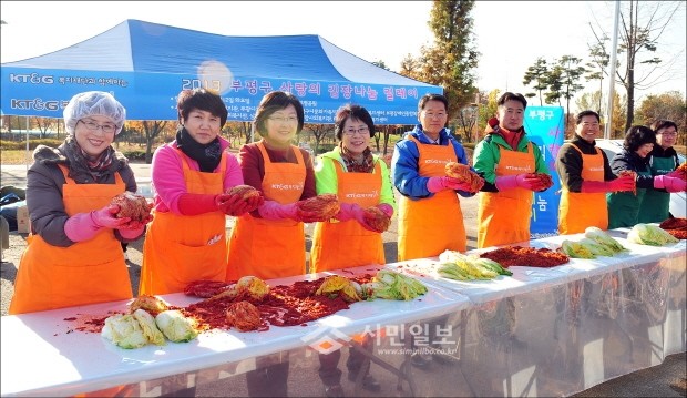 경기 부평구(구청장 홍미영)는 지난 12일 KT&G 복지재단과 함께 부평공원에서 ‘부평구 사랑의 김장 나눔 릴레이 행사’를 개최하고 총 1만㎏의 김장김치를 담갔다. 이번에 담근 김장김치를 지역내 저소득 노인과 재가대상자 등 1000가구에 전달된다. 사진은 홍미영 부평구청장과 KT&G 복지재단 관계자들이 김치를 담그고 있는 모습.