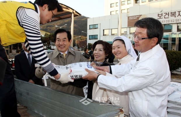 지난 11일 가톨릭대학교 의정부성모병원은 지역사회 나눔 활동의 일환으로 사랑의 쌀 나누기 행사를 진행했다. 성모병원에서 기증받은 쌀 10kg 400포는 의정부지역 불우이웃 350가구에게 전달됐으며 사진은 행사에 참여한 안병용 의정부시장, 전해명 성모병원장과 성모자선회 관계자들이 쌀을 배달차량에 싣는 모습.