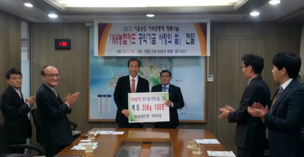 [시민일보]서울 서대문구 NH농협은행 가좌지점이 지난 12일 오후 구청을 방문해 '2013 서울농협 지역공동체 행복나눔' 행사의 일환으로 20kg들이 사랑의 쌀 100포를 전달했다.