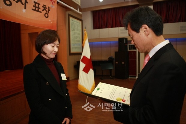 서울 강북구(구청장 박겸수)가 지난 12일 구청 4층 대강당에서 적십자 회비모금 유공자로 선발된 행정기관 2곳, 공무원 12명, 모금위원 17명(총 31명)에게 '2013년 적십자 회비모금 유공 표창'을 전달했다. 사진은 박겸수 강북구청장이 자치행정과 공무원에게 표창장을 전달하는 모습.