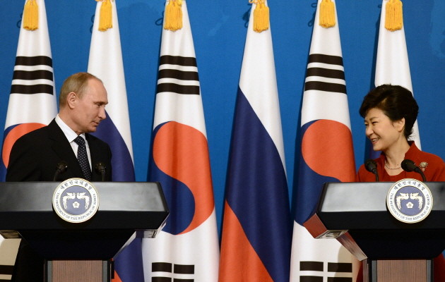 박근혜 대통령이 13일 오후 청와대에서 방한한 블라디미르 푸틴 러시아 대통령과 악수를 있다.