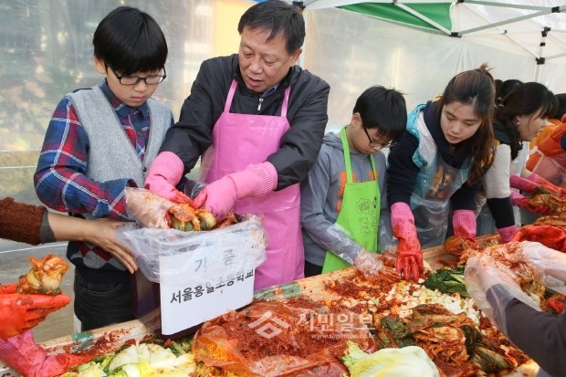 서울 금천구는 지난 13일 흥일초등학교에서 차성수 금천구청장과 흥일초교 전교생이 함께하는 '생태텃밭교실 김장나눔행사'를 진행했다. 이날 담근 김치는 지역내 복지시설과 어려운 이웃들에게 전달됐다. 사진은 김장김치를 배달 용기에 담고 있는 차 구청장과 아이들의 모습.