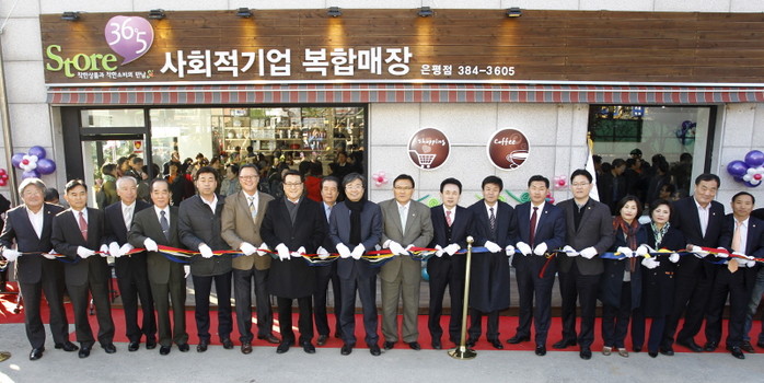 [시민일보]최근 서울 은평구는 구(舊)은평소방서 청사 1층에 전국 사회적기업 40개 업체에서 국산 먹거리, 친환경 생활용품, 여성의류 등 300여종의 제품과 은평구중소기업파발로 15개 업체의 주방용품 및 잡화 등 100여종의 제품이 입점한 「사회적기업 복합매장 스토어 36.5」를 오픈했다. 사진은 스토어 개장식에서 리본 컷팅식을 하고있는 김우영 은평구청장과 관계자들.