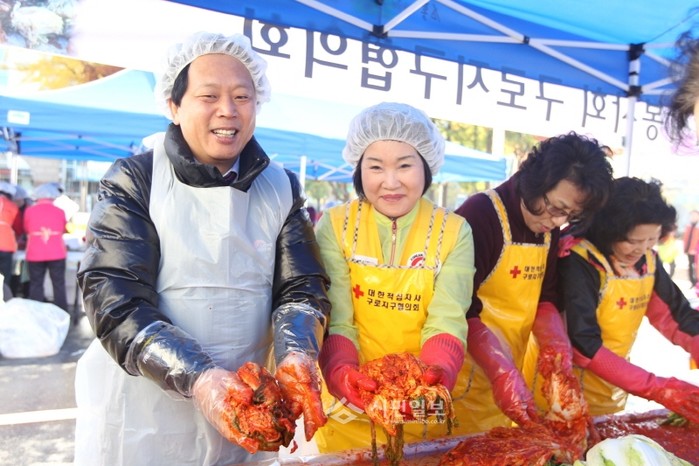 지난 13일 대한적십자봉사회, 한국자유총연맹, 자원봉사협력단장협의회 회원들이 참여한 봉사단체 연합 김장나눔 한마당이 구청광장에서 열렸다. 이날 만든 김장김치는 지역내 기초수급자, 차상위계층 가구에 전달된다. 사진은 행사에 참여한 이성 구로구청장과 회원들이 김장김치를 들고 포즈를 취하고 있는 모습.