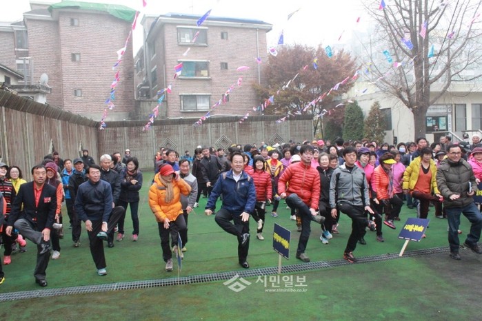 용인시 중앙동체육회가 지난 16일 중앙동주민센터에서 동민들이 참여한 가운데 '한마음 건강걷기대회'를 개최했다. 이날 참가자들은 주민센터를 출발, 용인초교 인근 금학천변 산책로 약5㎞의 코스를 함께 걸으며 화합의 시간을 가졌다. 사진은 주민들이 주민센터에서 출발하기 전 준비운동을 하는 모습.