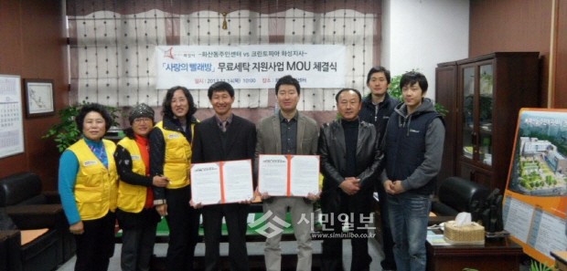 [시민일보]지난 14일 경기 화성시 화산동 주민센터와 크린토피아 화성지사는 홀몸노인 및 중증장애인 등 위생 취약계층에게 무료로 세탁지원을 해주는 '사랑의 빨래방' 협약식을 체결했다. 사진은 협약식 후 기념촬영 모습.