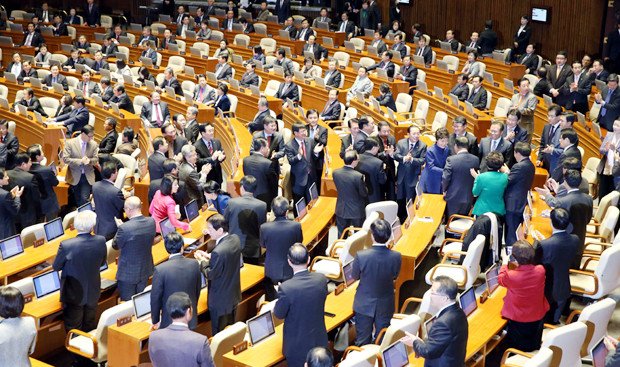 18일 오전 박근혜 대통령이 국회 본회의장에서 시정연설을 한 뒤 퇴장하면서 새누리당 의원들과 악수를 하고 있는 가운데 김한길 민주당 대표 및 의원들은 자리에 앉아 있다.