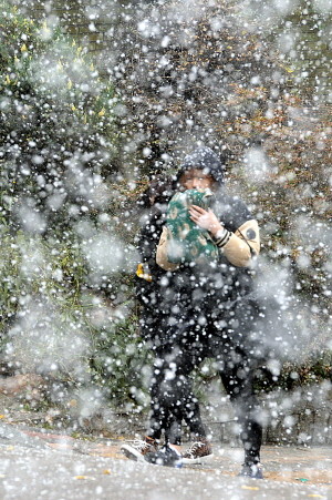 올 겨울 들어 서울에 강풍을 동반한 첫 눈이 내린 18일 오후 서울 마포구 서교동 거리를 시민들이 걷고 있다.