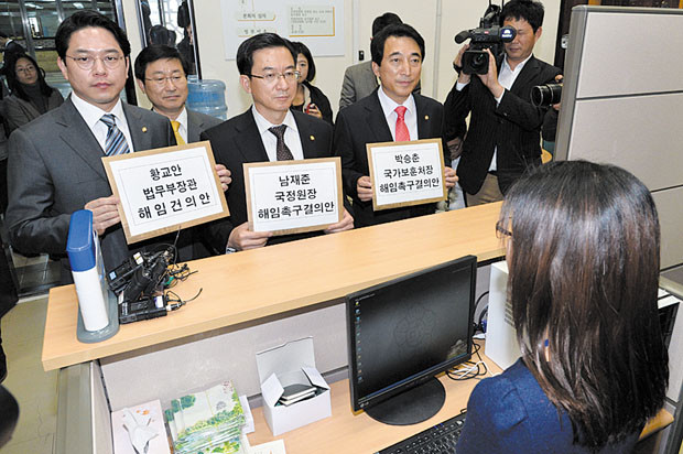 민주당 정성호 원내수석부대표, 정호준, 박수현 원내대변인, 박범계 의원이 19일 오후 서울 여의도 국회 의안과에서 황교안 법무부 장관 해임건의안과 남재준 국정원장, 박승춘 국가보훈처장에 대한 해임촉구결의안을 제출하고 있다.