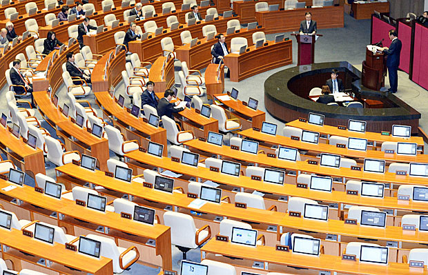 19일 오후 서울 여의도 국회에서 열린 320회 국회(정기회) 10차 본회의에서 민주당 의원들이 퇴장해 빈 자리가 보이고 있다. 이날 진행된 오후 본회의에서 이우현 새누리당 의원이 신상발언 중 “강기정 의원이 국회의원 신분으로 부적절한 행동을 했다”며 발언해 야당 의원으로부터 거센 비난이 쏟아졌다.