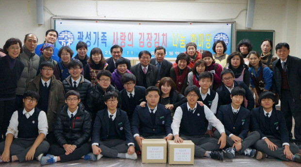 [시민일보]서울 마포구 신수동의 광성고등학교 학부모회는 지난 18일 엄재유 교장을 비롯해 학교 동문과 재학생 등이 함께한 가운데 500kg의 김장나눔 행사를 열었다. 김장김치는 지역내 기초생활보장수급자 및 차상위 계층 80가구에 재학생들이 직접 전달했으며 사진은 행사에 참여한 관계자들의 기념촬영 모습.