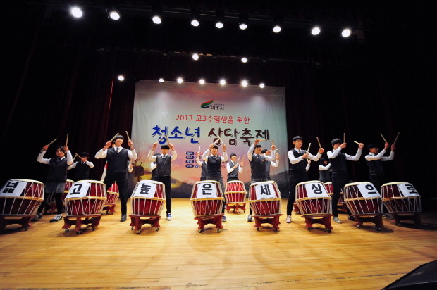 [시민일보]경기 여주시는 20일 세종국악당에서 여주고, 세종고, 제일고 학생들이 참여한 가운데 고3 수험생을 위한 '2013 청소년 상담축제'를 개최했다. 사진은 축제행사에서 난타공연을 하는 학생들의 모습.